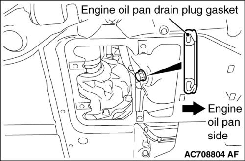 5. Install a new engine oil pan drain plug gasket so that it faces in the direction shown in the illustration, and then tighten the engine oil pan drain plug to the specified torque.