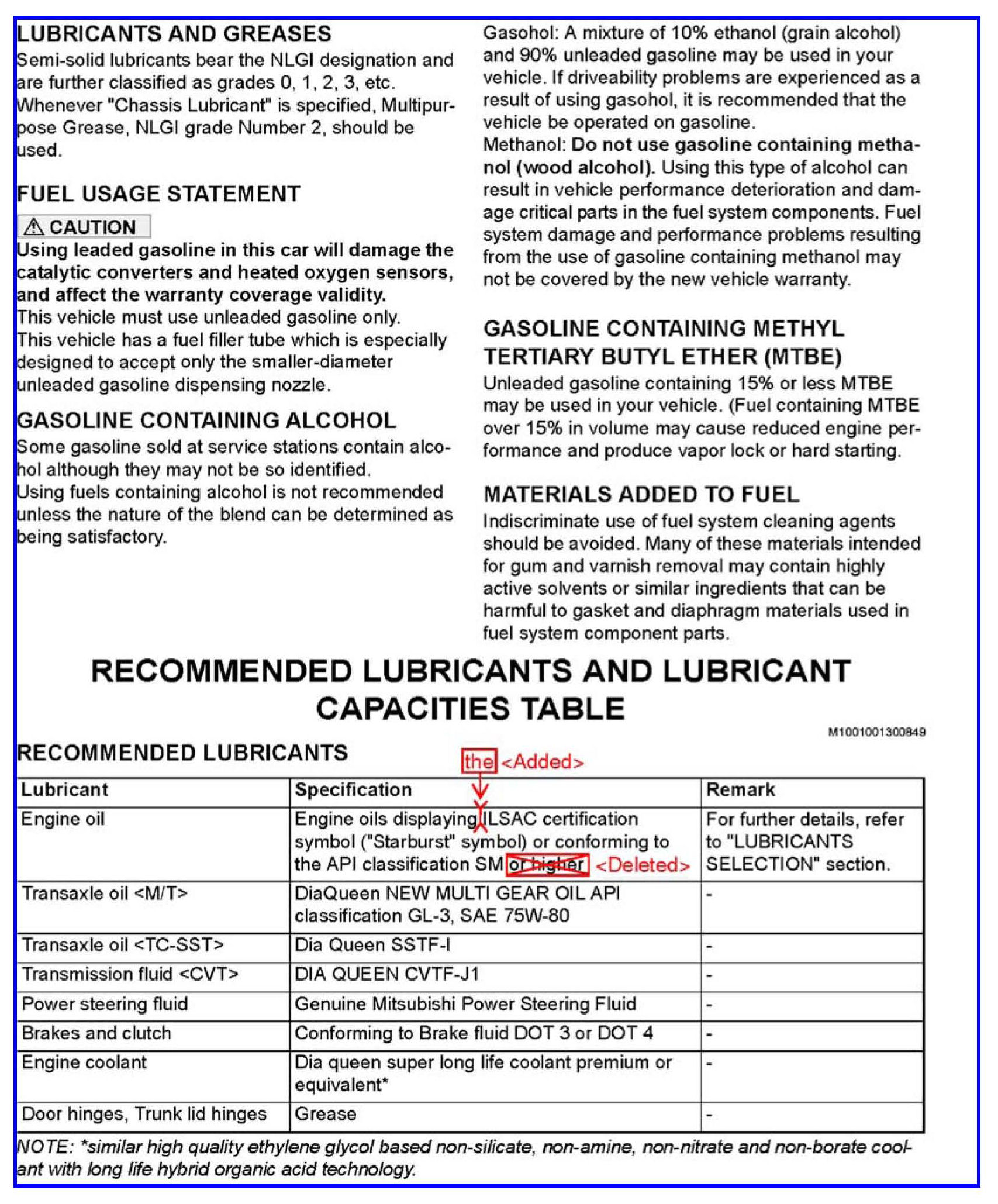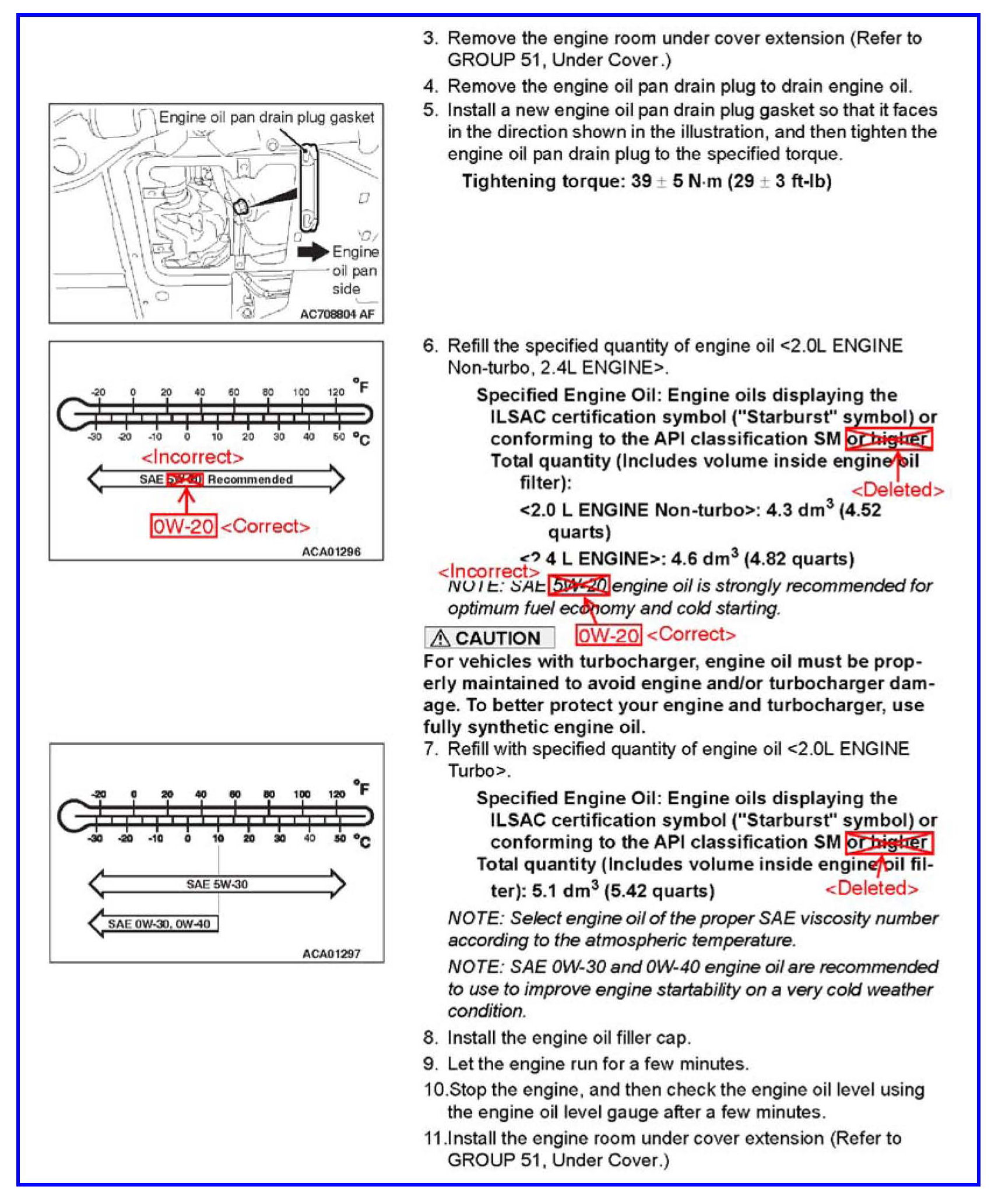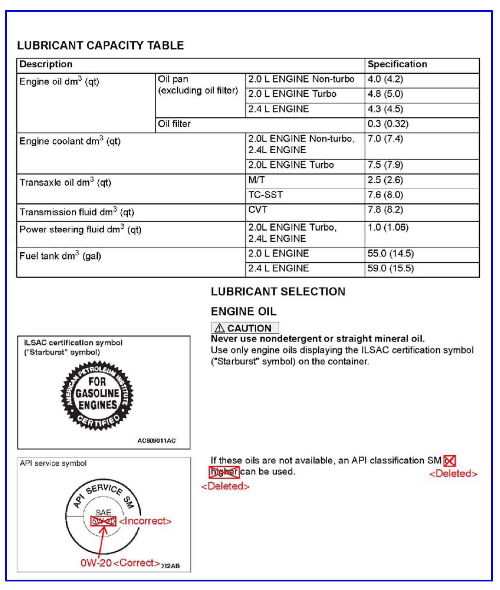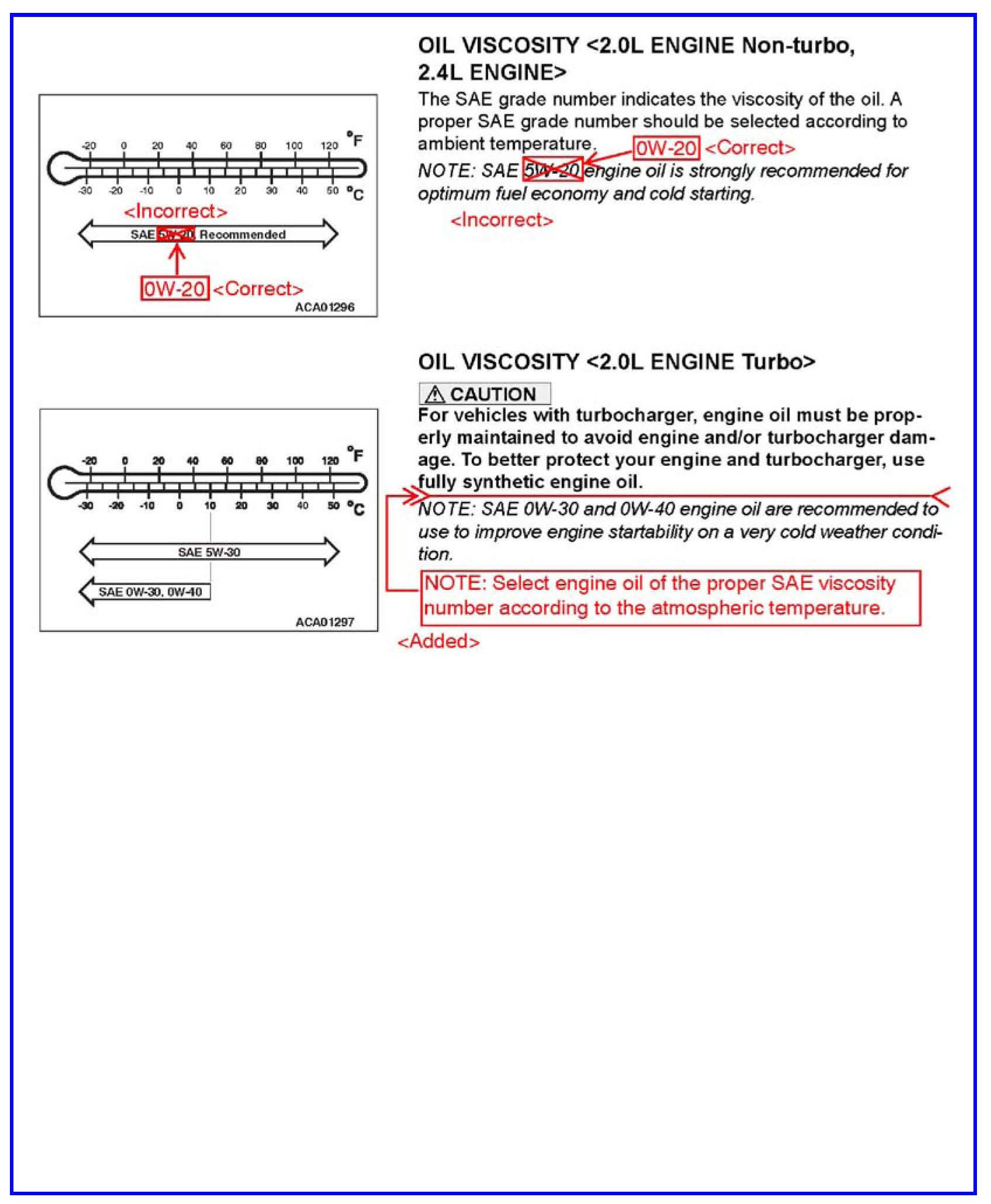 ^ For 2.4L and 2.0L non-turbo engines SAE 0W-20 engine oil is strongly recommended for optimum fuel economy and cold starting.
