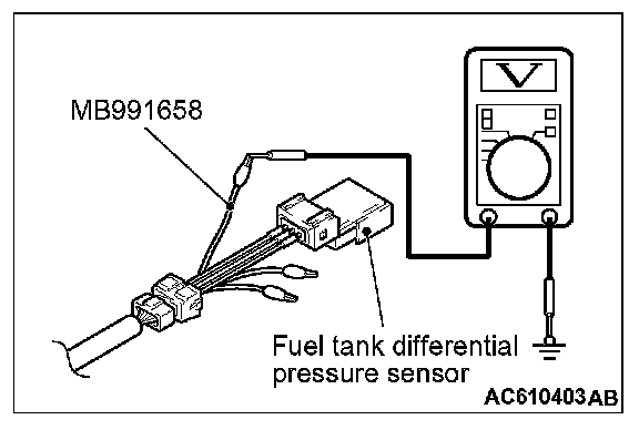 1. Disconnect the fuel tank differential pressure sensor connector and connect special tool MB991658 between the terminals of the disconnected connector.