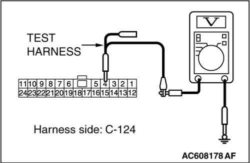 STEP 7. Check the wiring harness between joint connector (CAN3) C-124 and ECM connector B-109 [except RALLIART] for a short to power supply. Measure the voltage at joint connector (CAN3) C-124.