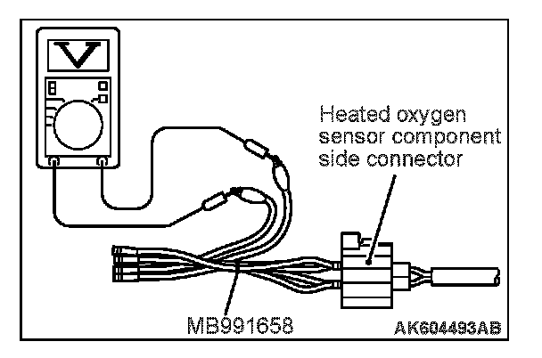 1. Disconnect the heated oxygen sensor connector and connect special tool MB991658 to the connector on the heated oxygen sensor side.
