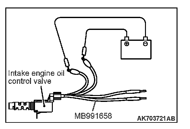 2. Check that the operation sound of the intake engine oil control valve can be heard when the positive battery voltage is supplied to the intake engine oil control valve. (Use the special tool MB991658 to connect terminal No. 2 of the intake engine oil control valve connector to the positive battery terminal and terminal No. 1 to the negative battery terminal.)