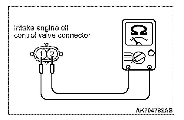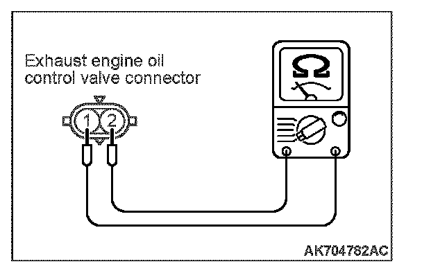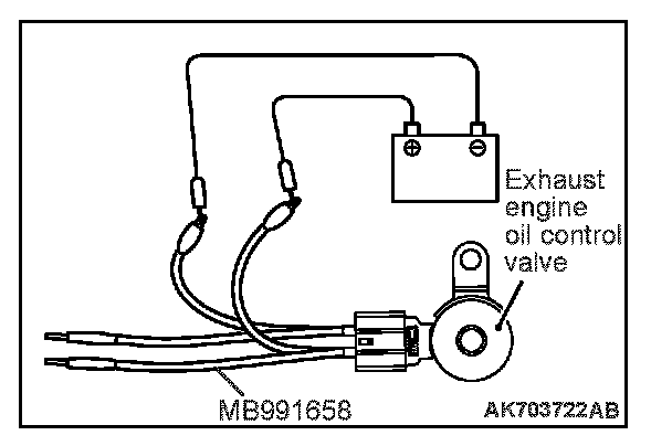 2. Check that the operation sound of the exhaust engine oil control valve can be heard when the positive battery voltage is supplied to the exhaust engine oil control valve. (Use the special tool MB991658 to connect terminal No. 2 of the exhaust engine oil control valve connector to the positive battery terminal and terminal No. 1 to the negative battery terminal.)