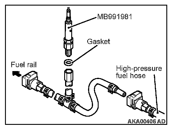 a. Via a gasket, install the special tool MB991981 (fuel pressure gauge set) into the special tool that has already assembled as described.