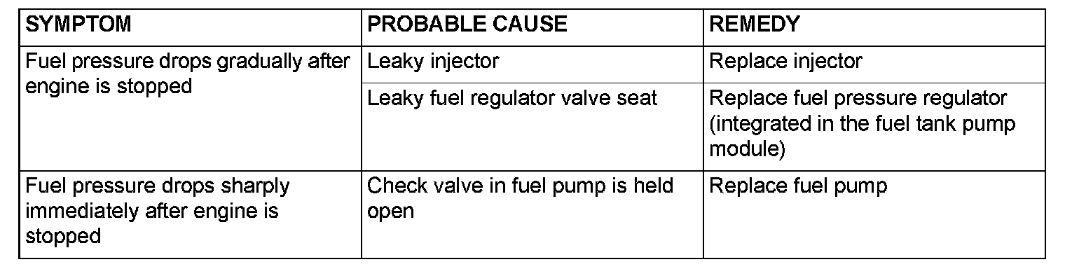 13. Stop the engine and observe fuel pressure gauge reading. It is normal if the reading does not drop within two minutes. If it does, observe the rate of drop and troubleshoot and repair according to the table below. Start, then stop the engine.