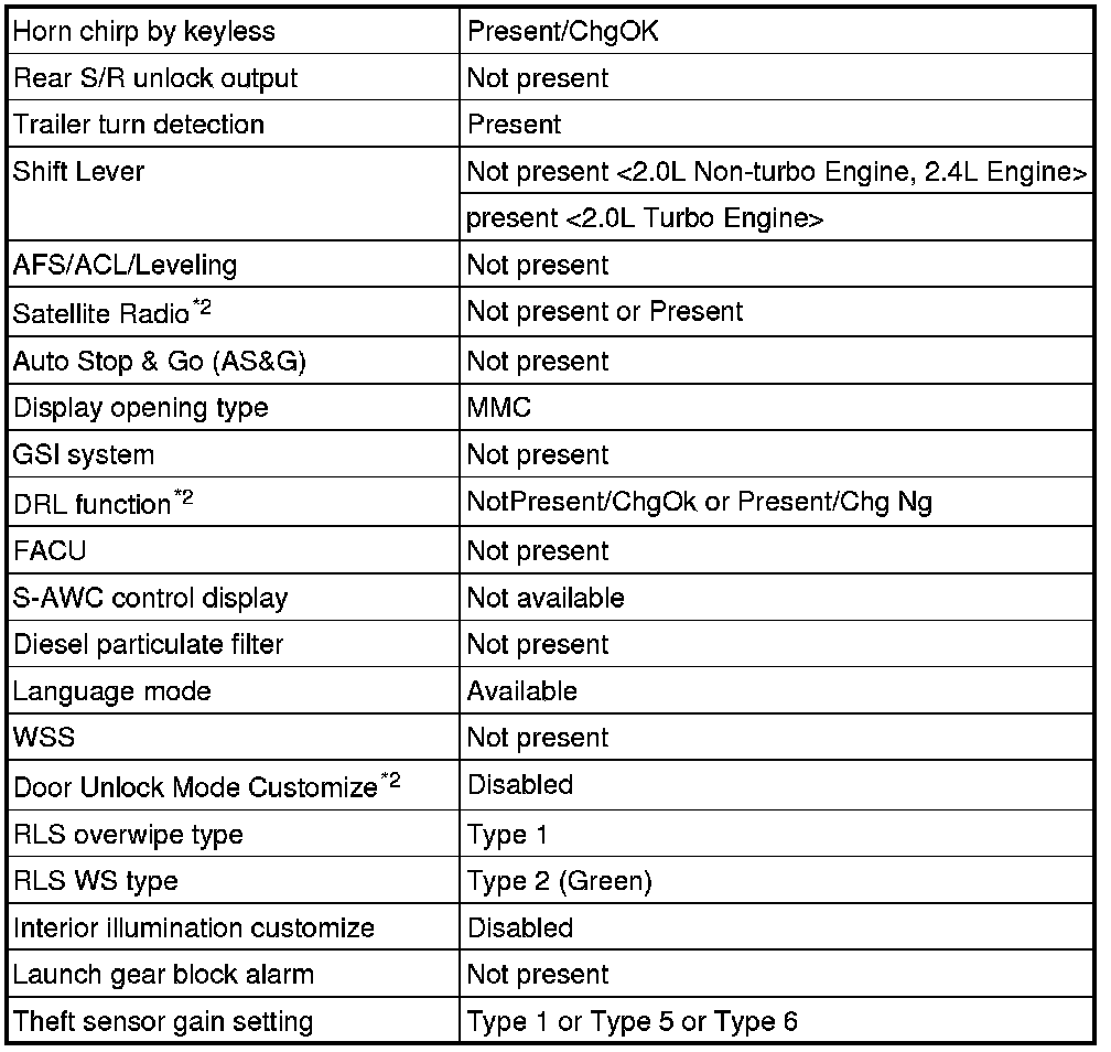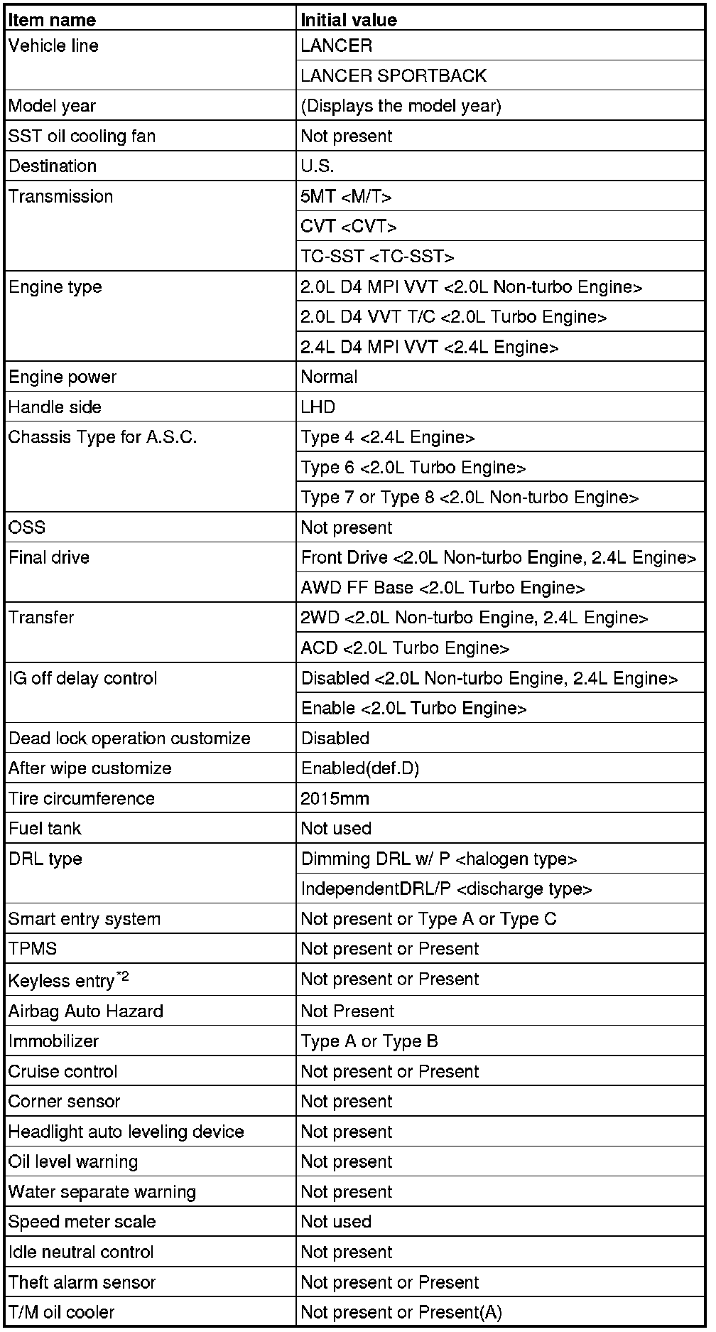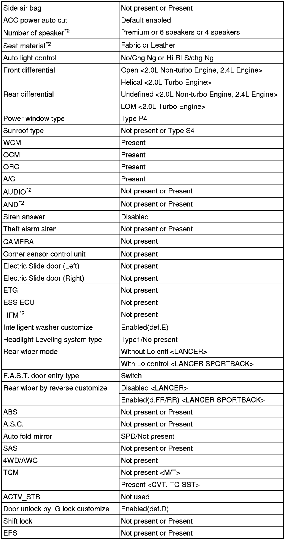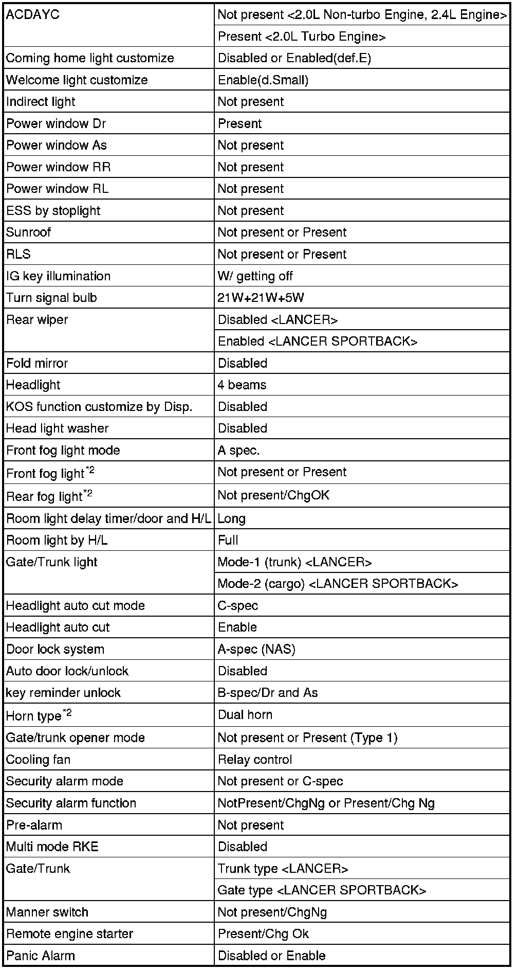 - If there is any item indicated by the option coding after equipment change, set ETACS-ECU so that the option coding data corresponds with the equipment content. Functions and systems do not work normally if the setting does not correspond with the equipment.