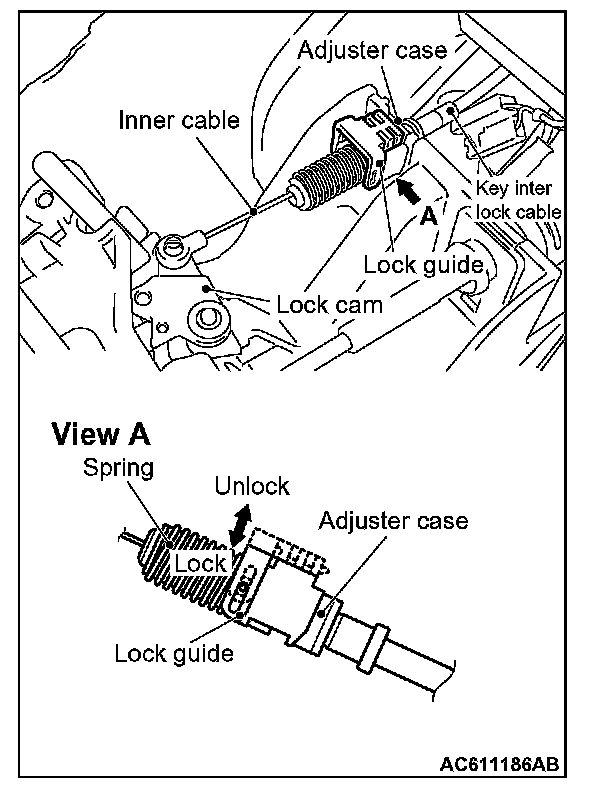 (3) Install the tip of the key interlock cable to the lock cam of the selector lever assembly, taking care not to twist the inner cable.