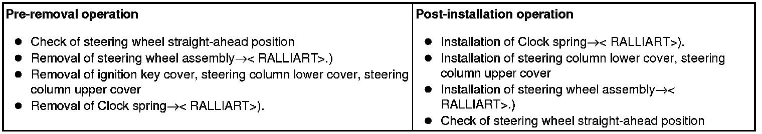 - To remove the driver airbag module, refer to Service Precautions Technician Safety Information and Driver's Air Bag Module and Clock Spring Removal and Installation (Except Ralliart) [Except RALLIART] or [RALLIART].