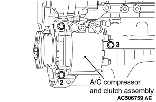 3. Tighten A/C compressor and clutch assembly mounting bolts to the specified torque in the order of number shown in the figure.