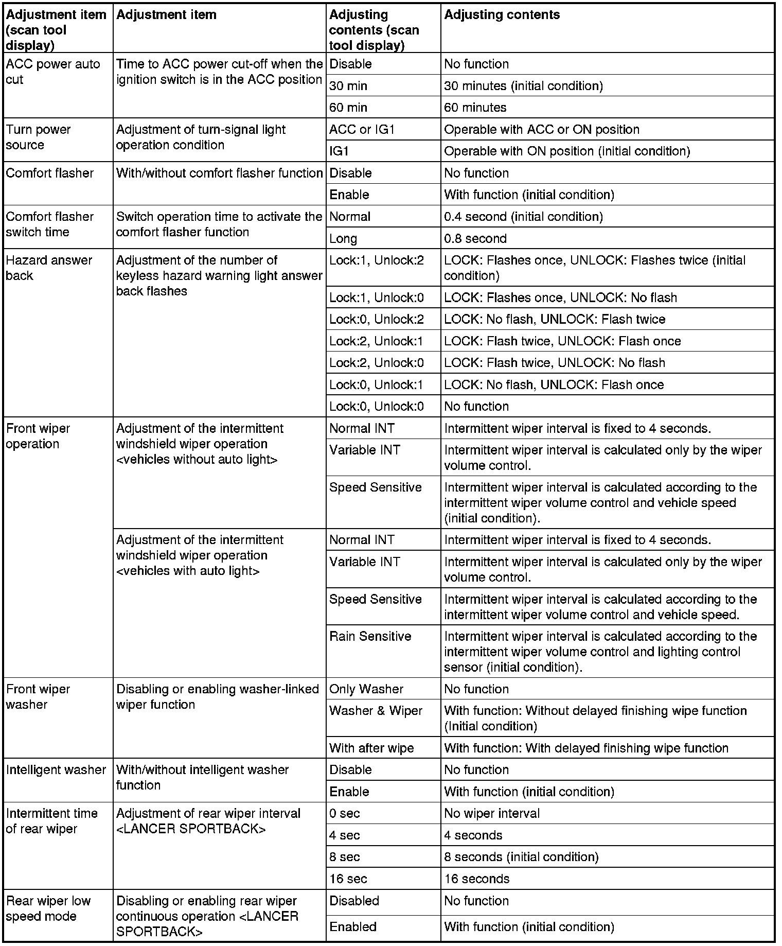 By operating the ETACS system or MMCS of scan tool MB991958, the following functions can be programmed. The programmed information is held even when the battery is disconnected.