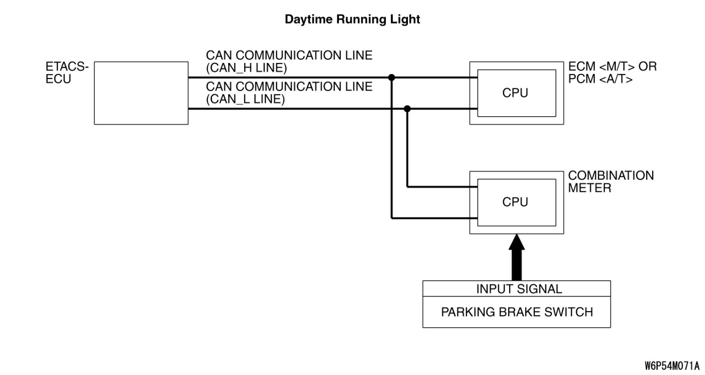 If the daytime running light function does not work, connector(s), wiring harness in the CAN bus lines, the ECM [M/T], the PCM [A/T], the combination meter, the ETACS-ECU or the input signal circuit may be defective.