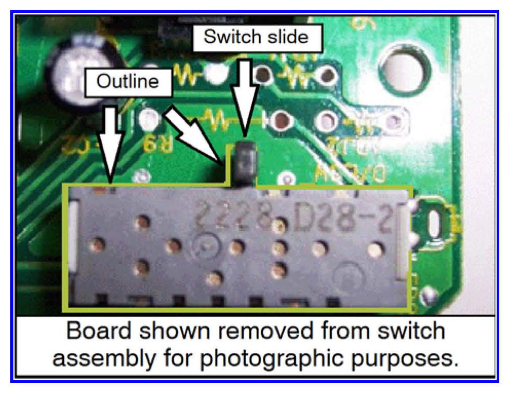 6. Look inside the switch assembly. Ensure the switch slide is in the correct position. It should be aligned with the outline around the slide switch assembly.