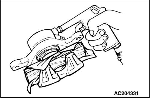 Place a piece of wood, etc. against the caliper body as shown. Blow compressed air through the brake hose connection hole to remove the piston boot and piston.