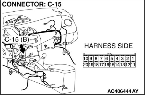 (1)Disconnect A/C-ECU connector C-15, and measure the resistance at the wiring harness side.