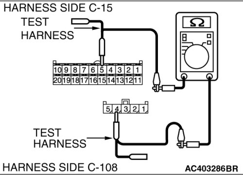 STEP 14. Check the wiring harness between A/C-ECU connector C-15 (terminal 5) and outside/inside air selection damper control motor connector C-108 (terminal 4).