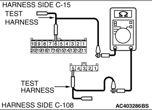 STEP 16. Check the wiring harness between A/C-ECU connector C-15 (terminal 6) and outside/inside air selection damper control motor connector C-108 (terminal 5).