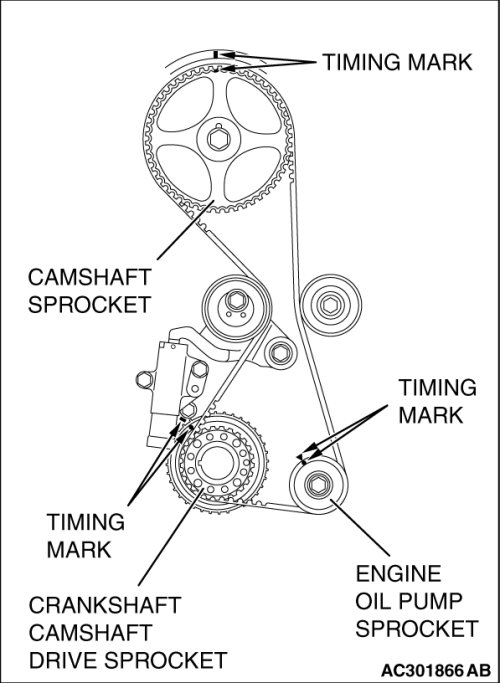 1. Align the timing marks on the camshaft sprocket, crankshaft camshaft drive sprocket and engine oil pump sprocket.