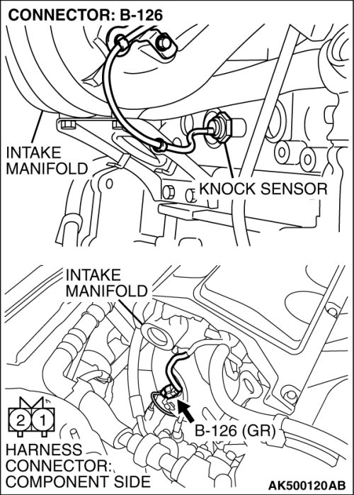 (1)The ignition timing should retard more when knock sensor connector B-126 is disconnected than when it is connected.