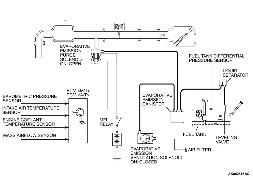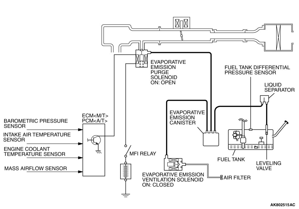 An EVAP ventilation solenoid is provided between the EVAP canister and atmosphere to monitor for OBD-II EVAP leaks. This solenoid is normally OFF. However, it turns ON when monitoring the OBD-II EVAP leaks and shuts off the atmosphere flow to the EVAP canister. Then the fuel tank differential pressure sensor monitors the fuel vapor pressure to detect OBD-II EVAP leaks. The leveling valve prevents fuel leaks if the vehicle is rolled over in an accident.