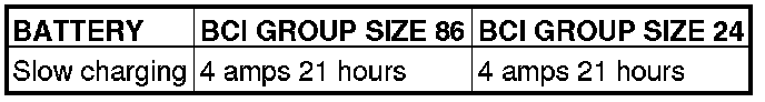 Recommended rate and time for fully discharged condition (flat discharged) is shown below. When the specific gravity of electrolyte keeps 1.22 - 1.29 for more than one hour, charging should be stopped.