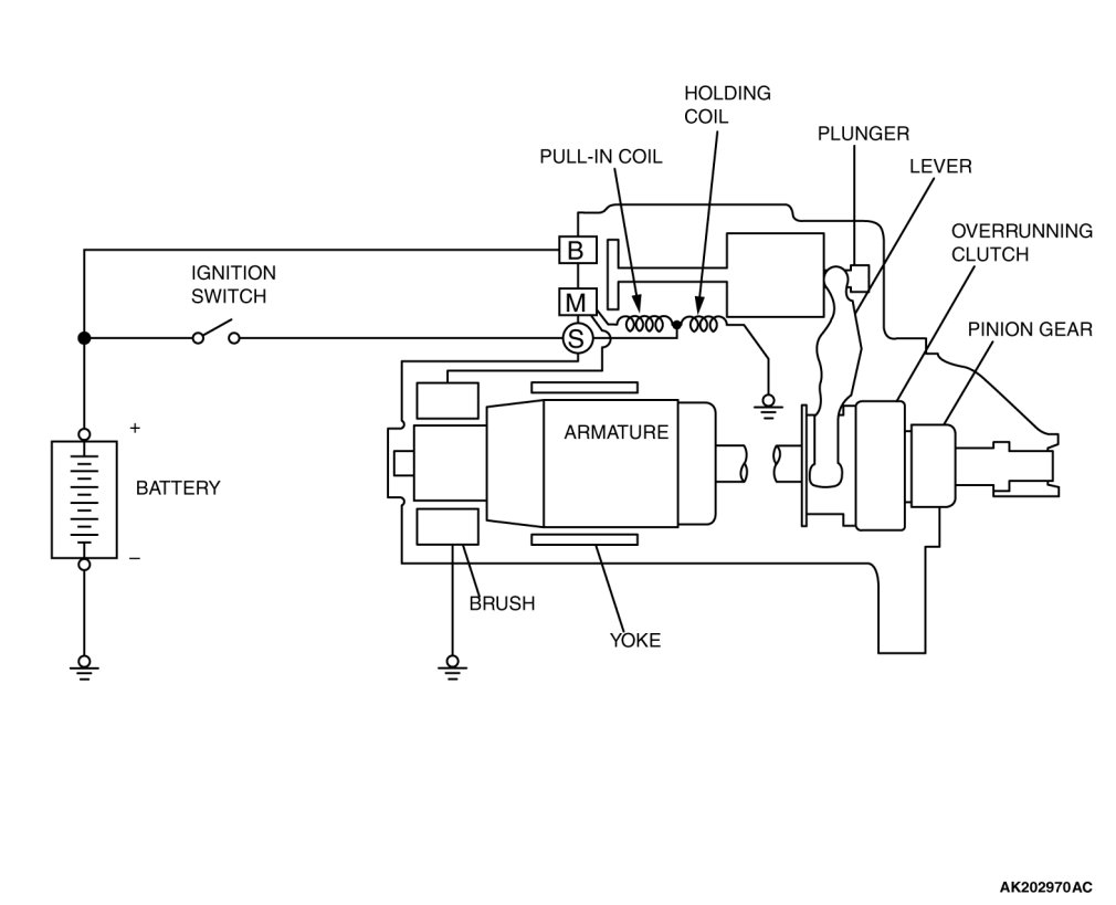 If the ignition switch is turned to the "START" position, current flows in the coil provided inside magnetic switch, attracting the plunger. When the plunger is attracted, the lever connected to the plunger is actuated to engage the starter clutch.