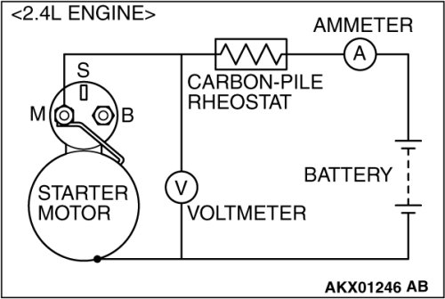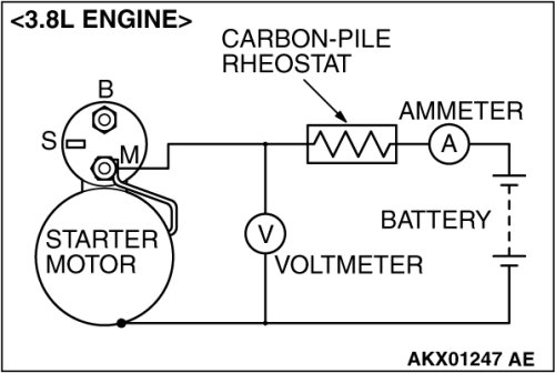 2. Connect a test ammeter (100-ampere scale) and carbon pile rheostat in series between the positive battery terminal and starter motor terminal.