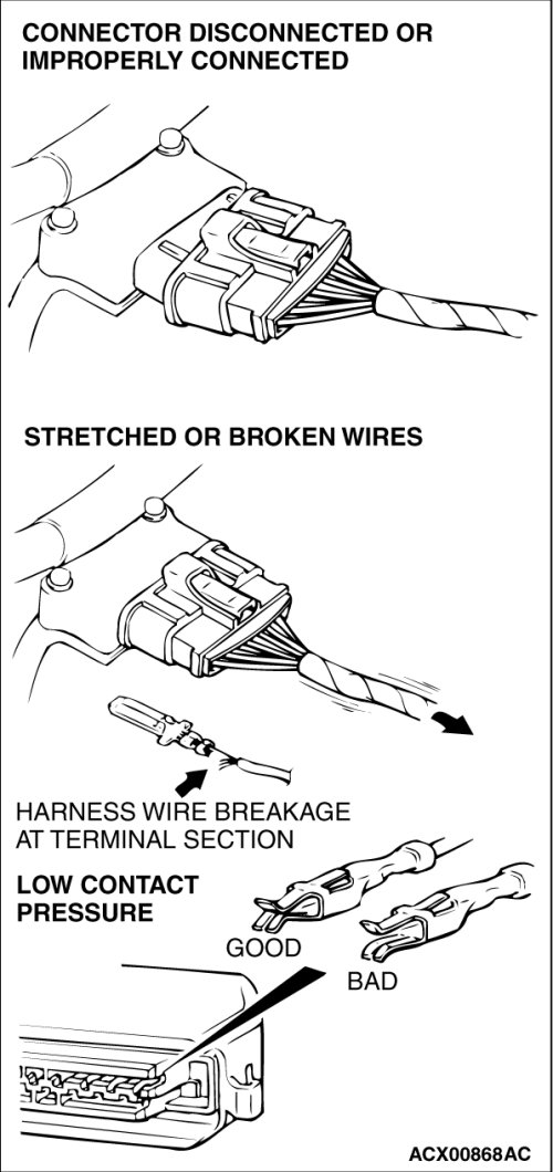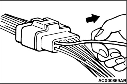 Use special tool MB991219 to inspect the engagement of the male pins and female pins. [Pin drawing force: 1 N (0.2 pound) or more]