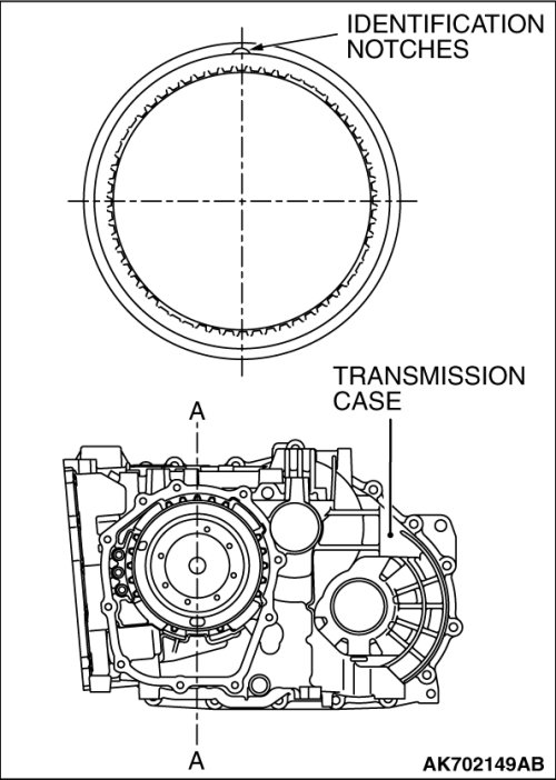 5. Check the placement of the identification notches in the one-way clutch inner race. Install the one-way clutch inner race to the transfer drive gear bearing so that the notches fall along the A - A line.