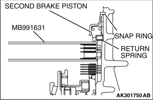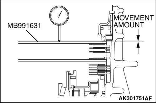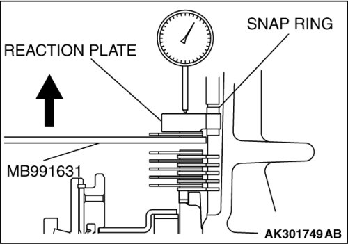 12. Move special tool MB991631 to measure the end play of reaction plate. Then replace the snap ring installed in step 11 to adjust the end play to standard value.