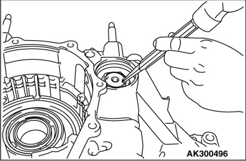 1. Install special tool MD998412 in the installation screw hole of the transfer drive gear bearing located in the transaxle case. Using this as a guide, install the transfer drive gear bearing and gear in the transaxle case.