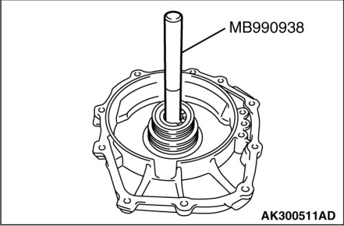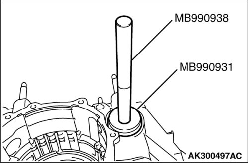 22. Use special tools MB990930 and MB990938 to tap the output shaft bearing outer race in the transaxle case.