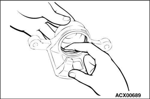 Place a piece of wood, etc. against the caliper body as shown. Blow compressed air through the brake hose connection hole to remove the piston boot and piston.