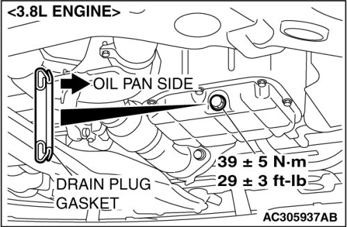 3. Install a new drain plug gasket so that it faces in the direction shown in the illustration, and then tighten the drain plug to the specified torque.