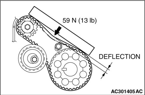 (2) Apply a pressure of 59 N (13 pounds) at the center (arrow area) between the sprocket as shown in the figure, then check whether the belt deflection is within the standard value.