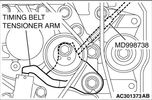 Special tool MD998738 must be gradually installed at a rate of 30 degrees per second. If it is screwed in all at once, the timing belt tensioner adjuster rod will not easily retract and special tool MD998738 may bend.