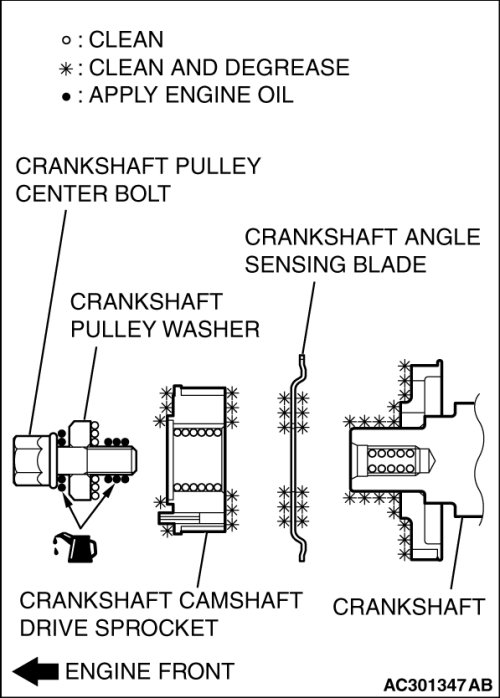 1. Clean or degrease the crankshaft, the crankshaft angle sensing blade, the crankshaft camshaft drive sprocket and crankshaft pulley washer as shown.