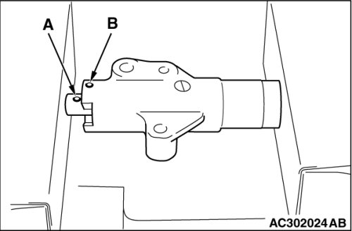 Gradually screw in special tool MD998738 and then align the timing belt tensioner adjuster rod set hole A with the timing belt tensioner adjuster cylinder set hole B.