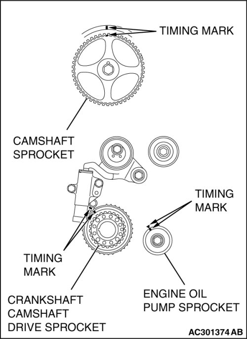1. Align the timing marks on the camshaft sprocket, crankshaft camshaft drive sprocket and engine oil pump sprocket.