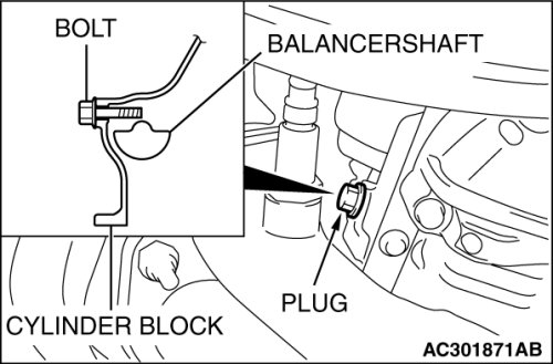 Insert a bolt (M6, section width 10 mm, nominal length 45 mm) in the plug hole. If the bolt comes in contact with the balancer shaft, turn the engine oil sprocket one rotation. Re-adjust the timing mark and then check to see that the bolt fits. Do not remove the bolt until the valve timing belt is assembled.