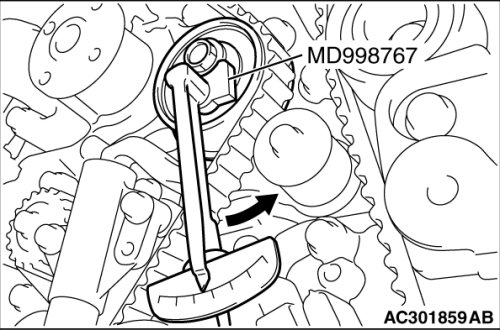 4. Turn the timing belt tensioner pulley in the direction shown in the figure using special tool MD998767 to apply tension to the valve timing belt. Then temporarily tighten and fix the timing belt tensioner pulley mounting bolt.