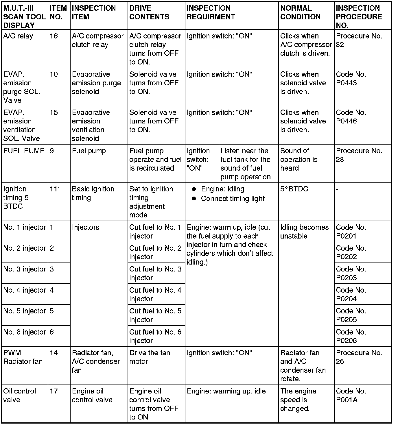 ACTUATOR TEST REFERENCE TABLE