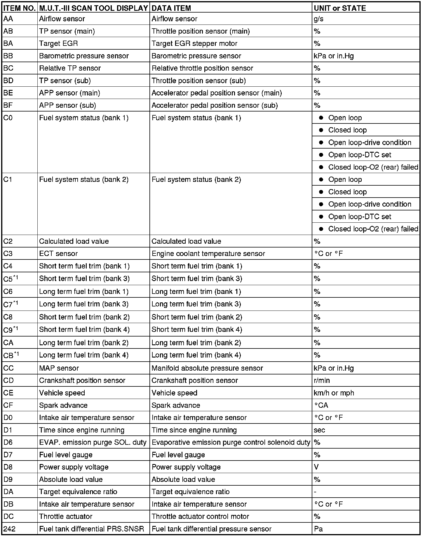 *: Data items are displayed on M.U.T.-III display, but the V-type 6-cylinder engine is not applicable and its data is displayed as "****".