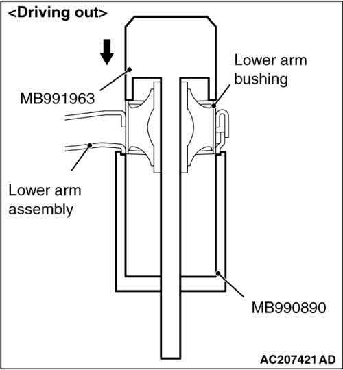 1. Use special tools MB991963 and MB990890 to drive out the lower arm bushing.