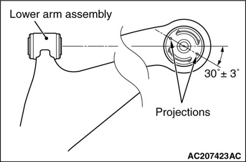 2. Position the lower arm bushing so that its projections are positioned as shown, and then use special tools MB991963, MB990889 and MB990890 to press in the lower arm bushing.