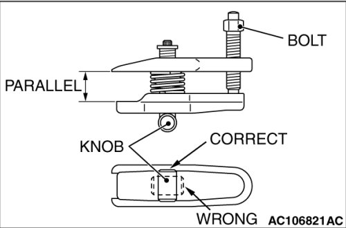 2. Turn the bolt and knob as necessary to make the jaws of special tool parallel, tighten the bolt by hand and confirm that the jaws are still parallel.
