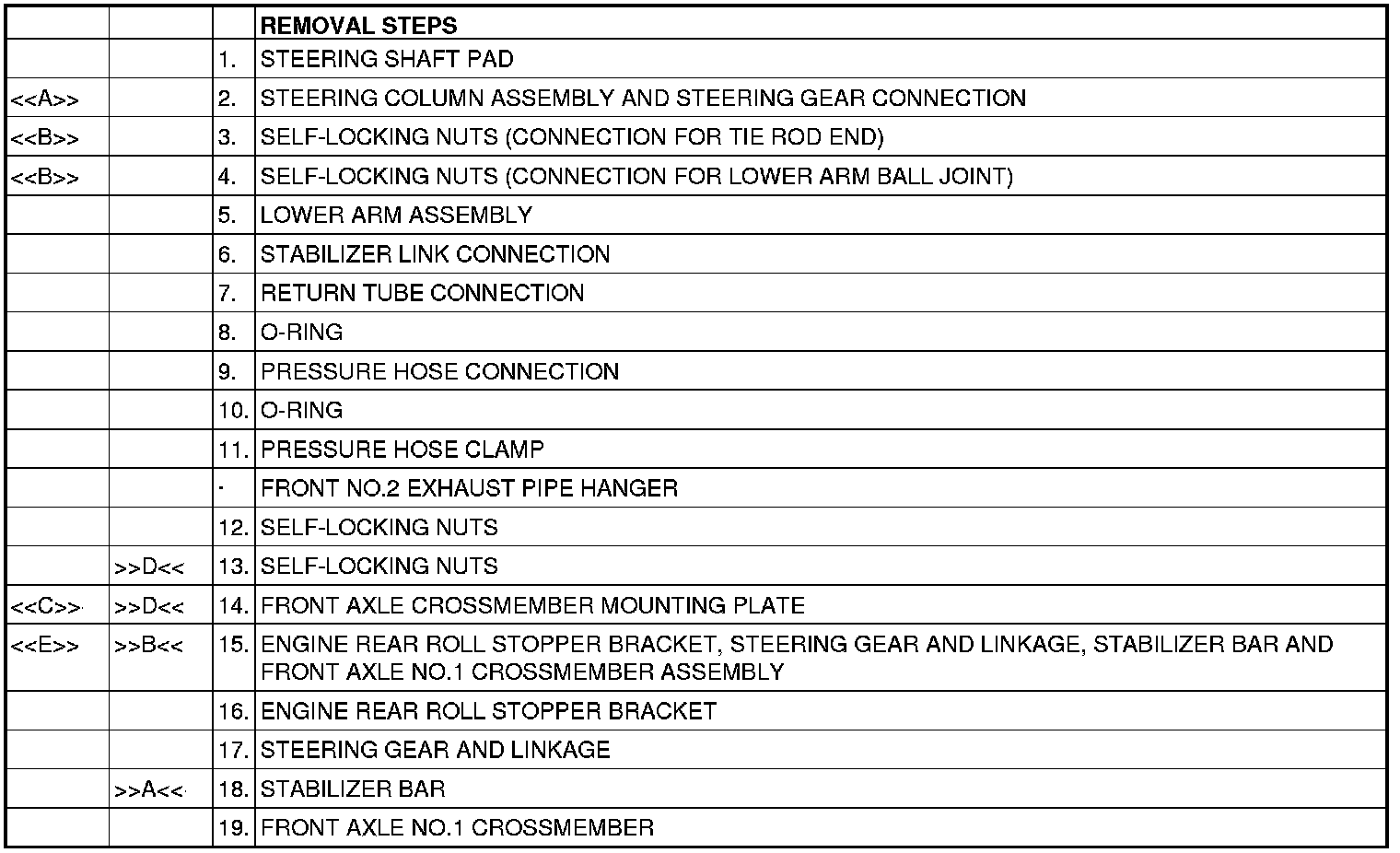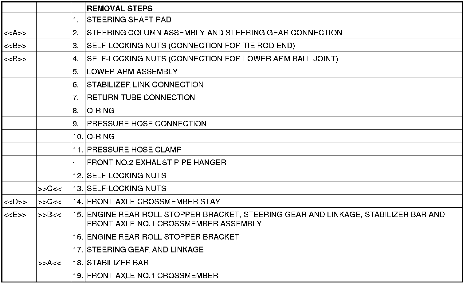 [[E]] ENGINE REAR ROLL STOPPER BRACKET, STEERING GEAR AND LINKAGE, STABILIZER BAR AND FRONT AXLE NO.1 CROSSMEMBER ASSEMBLY REMOVAL