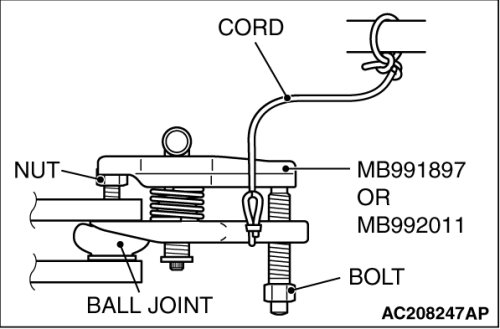 Replace the self locking nut for lower arm ball joint with a regular nut, because the original one is a little bit large to install special tool MB991897 or MB992011. Install the special tool as shown in the figure.