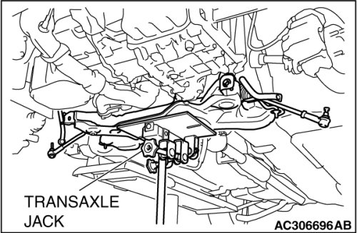 Support the front axle number 1 crossmember with a transaxle jack, and then remove the crossmember mounting nuts and bolts.