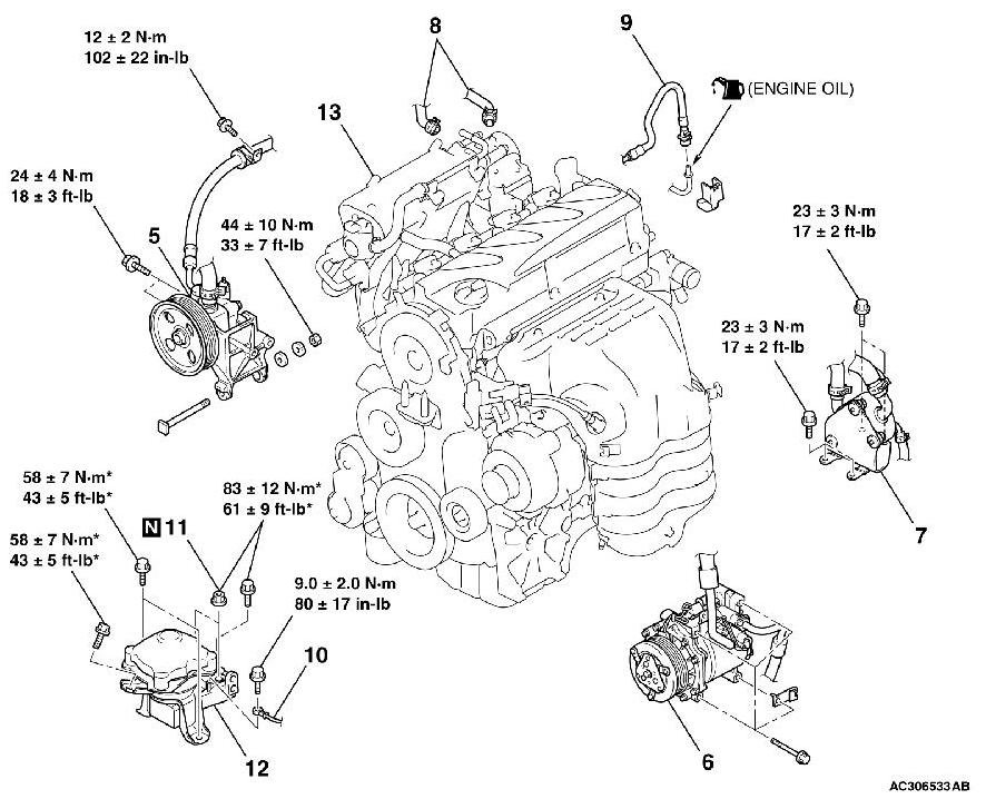 - *: indicates parts which should be temporarily tightened, and then fully tightened with the engine weight applied on the vehicle body.