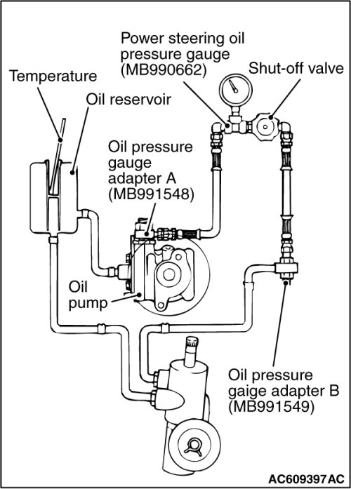 1. Disconnect the pressure hose from the oil pump, and then connect the special tools MB991548, MB990662 and MB991549.